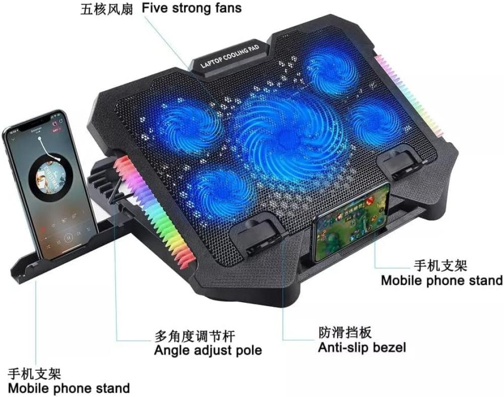 قاعدة تبريد احترافية مخصصة للاعبين، موديل S500، تتميز بإضاءة RGB جذابة، وشاشة عرض لمراقبة السرعة والحرارة، بالإضافة إلى حامل مدمج للهاتف المحمول لسهولة الاستخدام أثناء اللعب أو العمل.